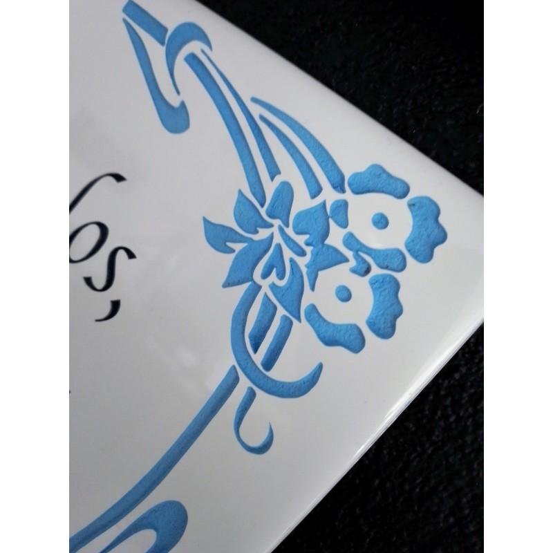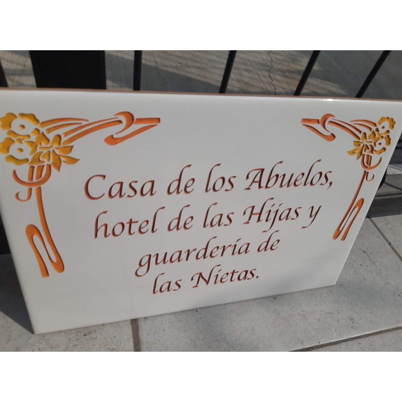 Rótulo grabado en cerámica bajo relieve, aplicación de color a dos tintas. Para una bienvenida a su hogar, en el jardín, para logo de empresas, señalamientos, y también son solicitados para lápidas. Se adhiere fácil a cualquier superficie. Grabado con sand-blast y se pueden aplicar más tintas, previa cotización. Medida 20cm x 30cm.