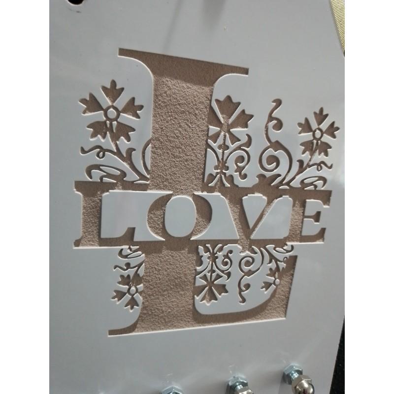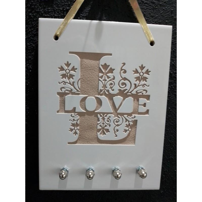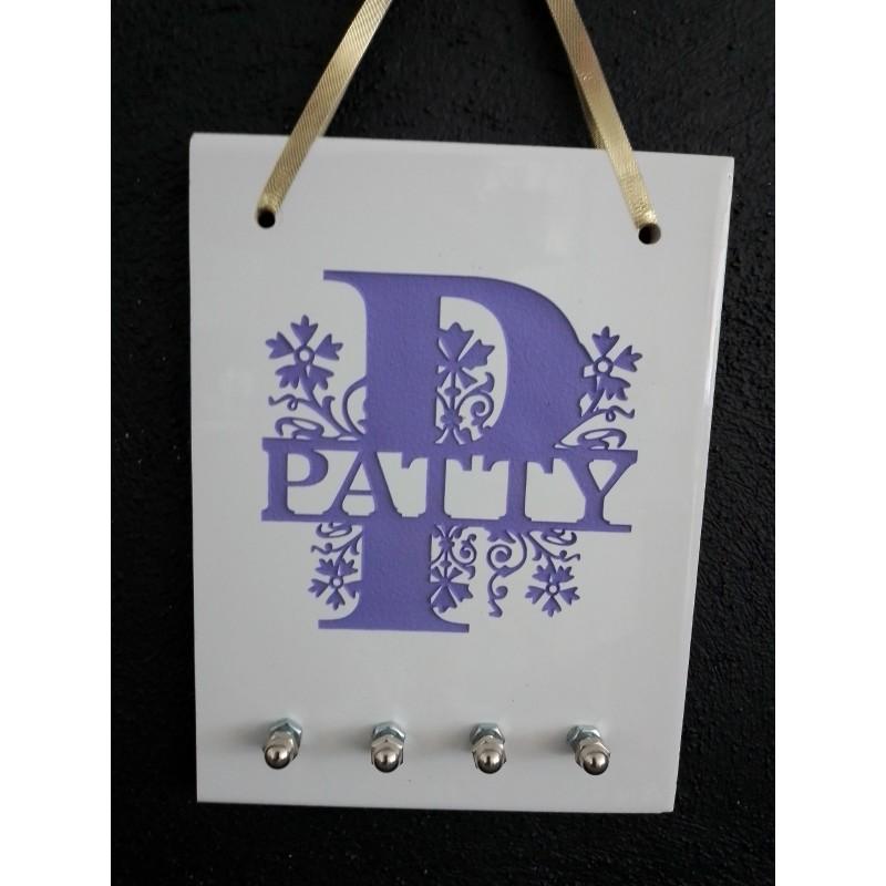 Original tablero decorativo con función de portallaves con 4 percheros. Realizado sobre cerámica y grabado sand-blast bajo relieve. Medidas: 20cm de altura por 15cm de ancho. Diseño de Inicial y nombre propio breve (de todo el abecedario). Puede aplicarse un color ¡tenemos todos! también disponibles los diseños de Home y de Love a la orden.