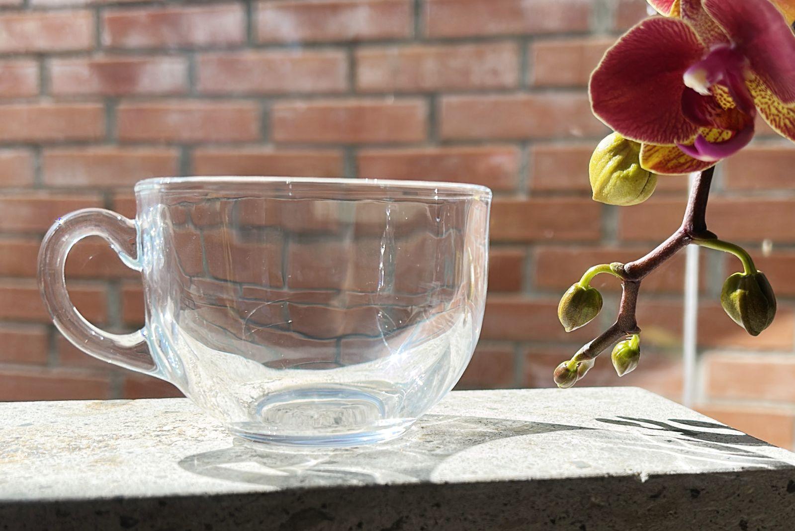 Taza de cristal transparente de alta resistencia, diseñada para mantener tus bebidas calientes o frías por más tiempo. Cuenta con asa ergonómica para un agarre seguro y diseño redondo clásico.